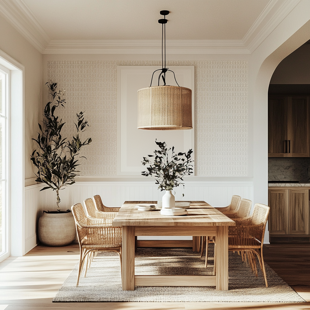 Woven elements are the secret weapon of a warm minimalist dining room. They add organic texture without visual noise. Try these ideas:
