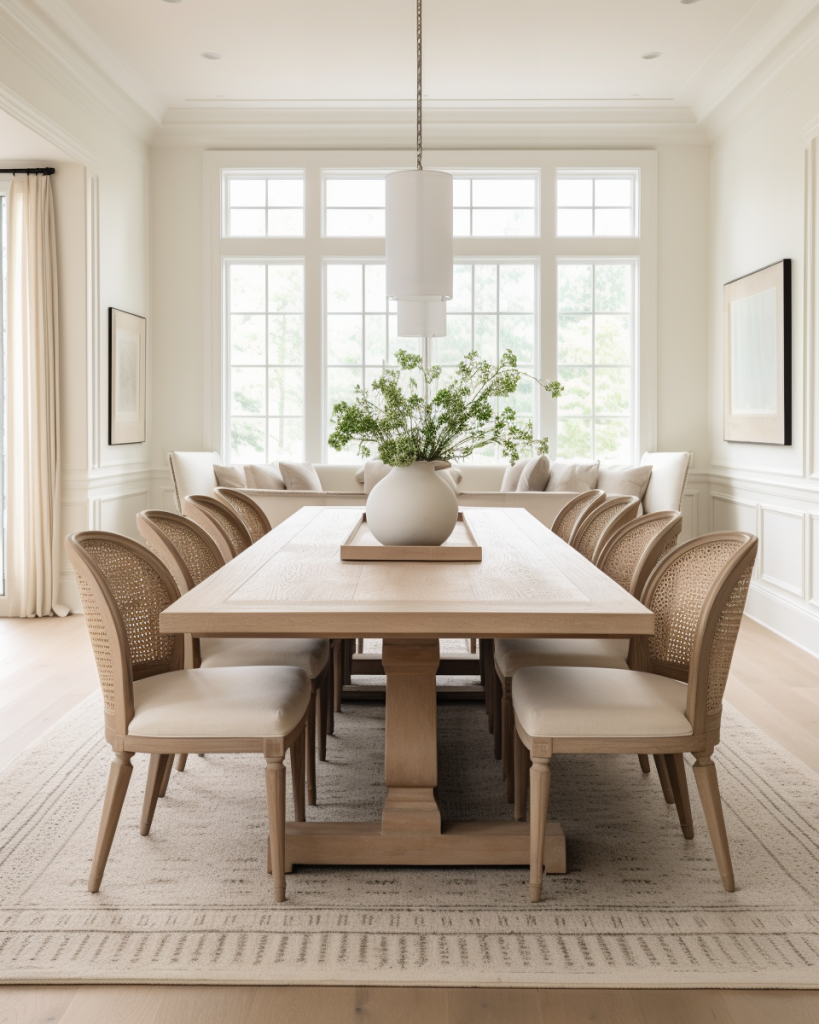 • Seating: Woven-back chairs (like cane or bamboo) pair beautifully with a solid wood table.