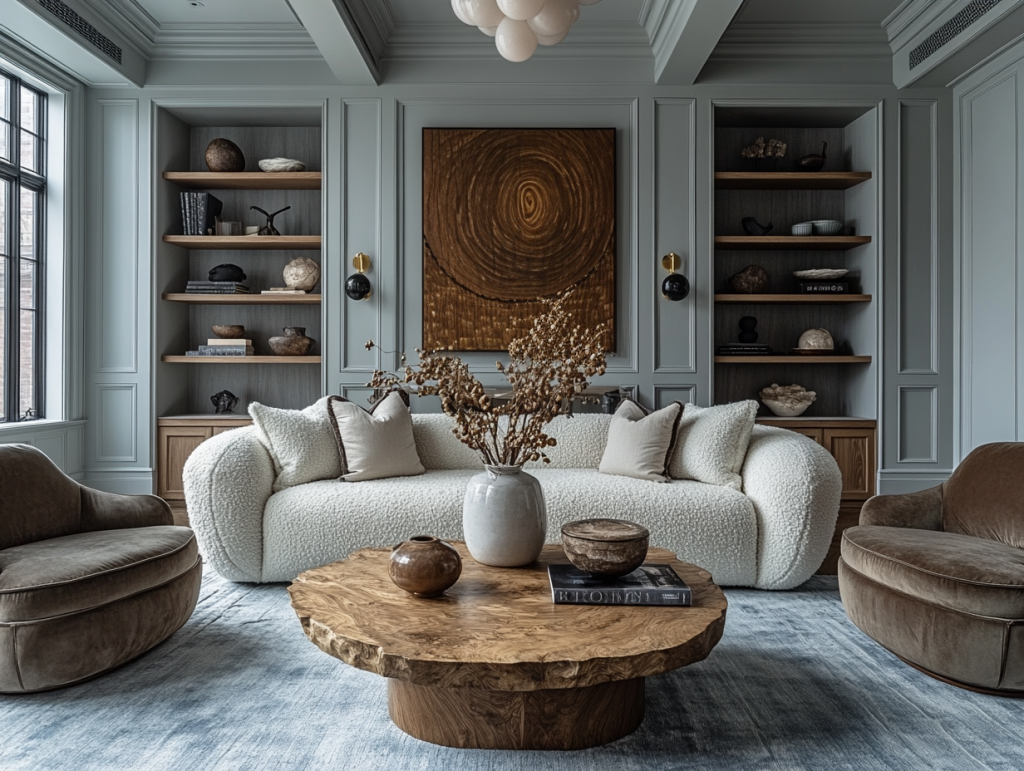 - Neutral palettes like warm whites, taupes, and soft grays
